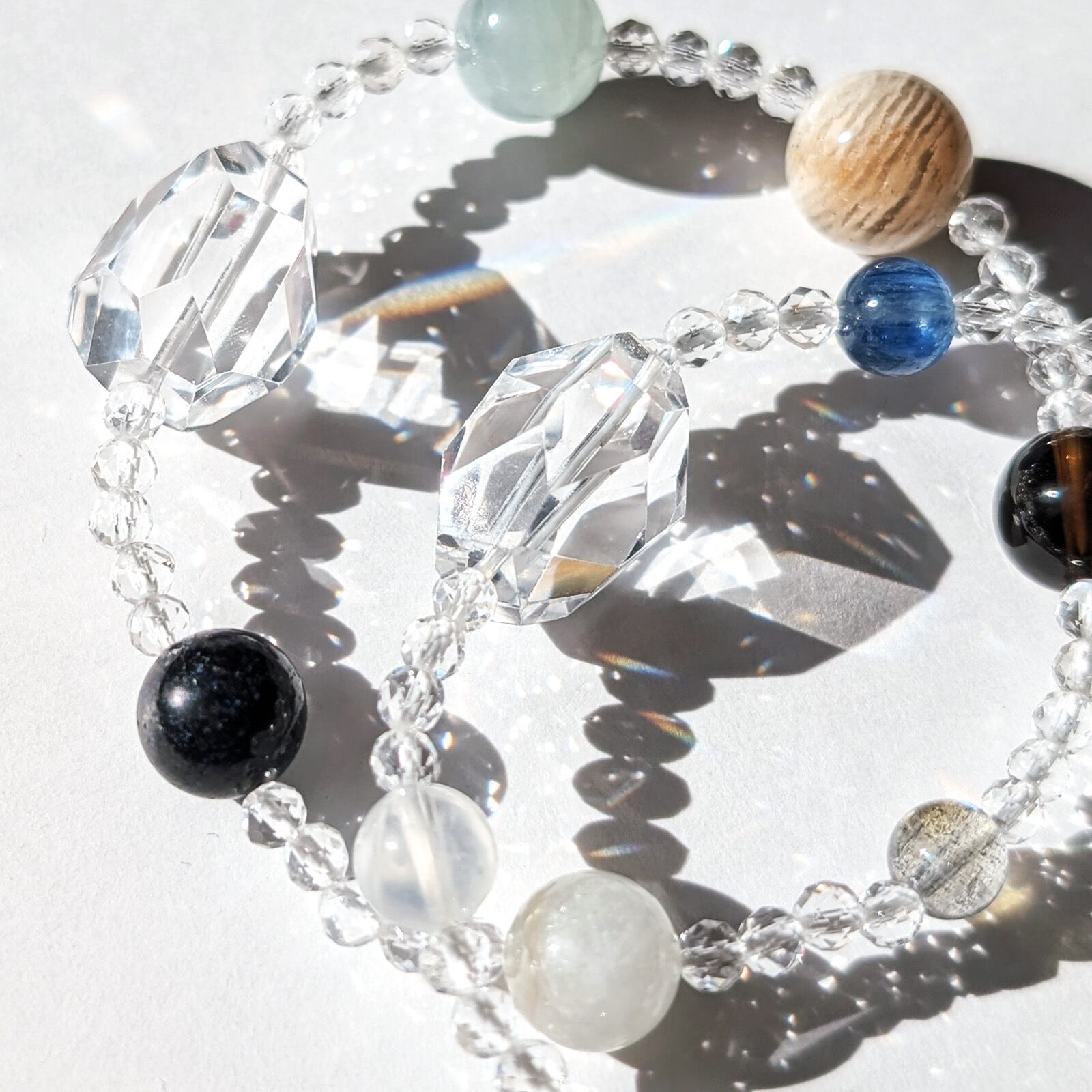 Planet/一点もの 水晶×千層ホワイトガーデンファントムクォーツ×ブラックマトリクスオパール プラネットブレスレット
