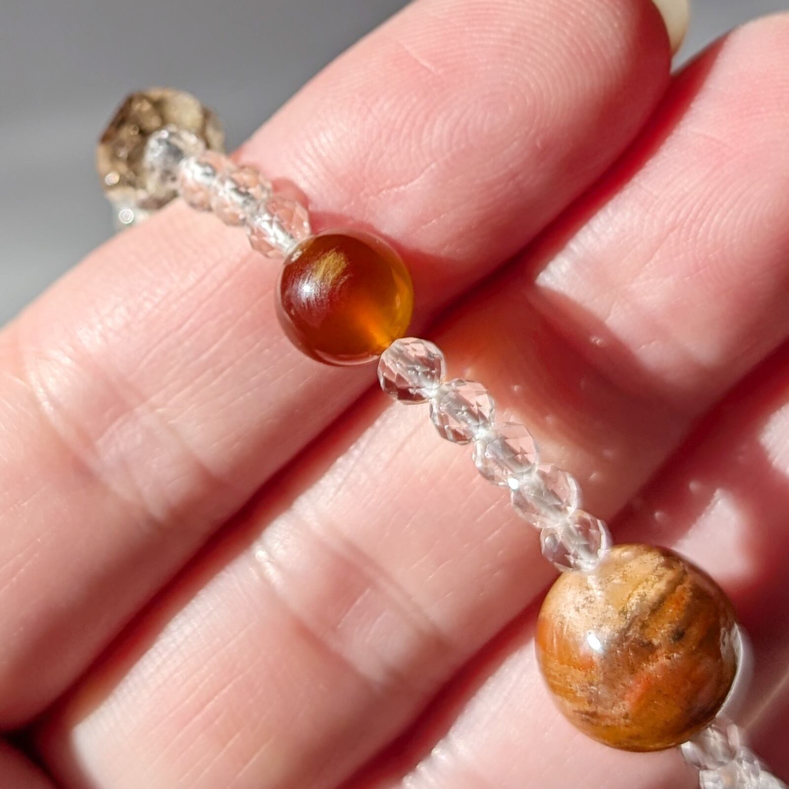 光を透過すると琥珀のような雰囲気になる、プラジオクレースムーンストーン。