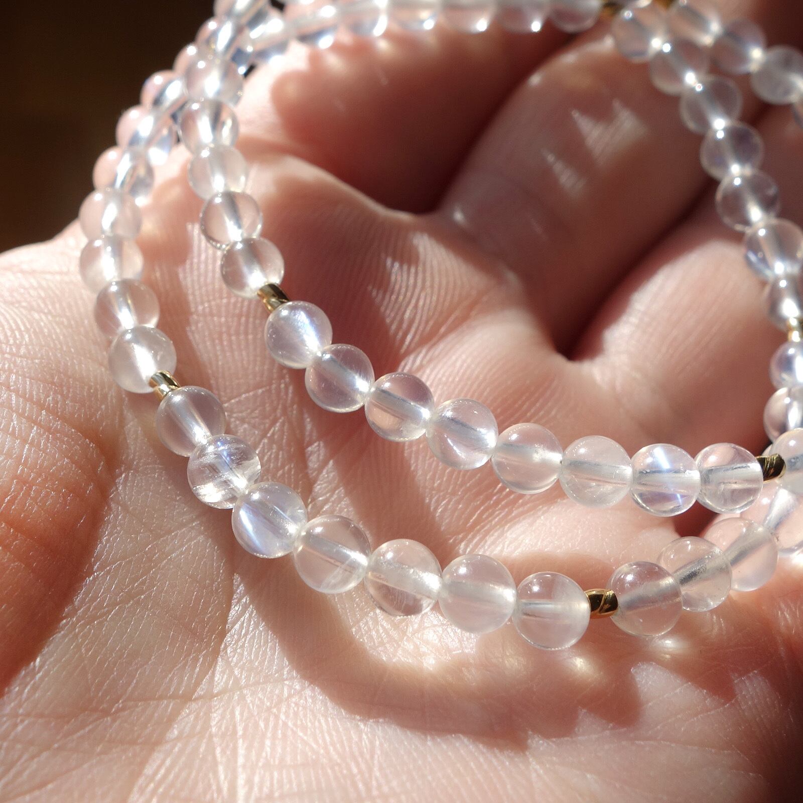このブレスレットに使用しているムーンストーンは、一般的なムーンストーンが持つヴェールのような柔らかい光とは対照的に、スポットライトのような光り方をしています。