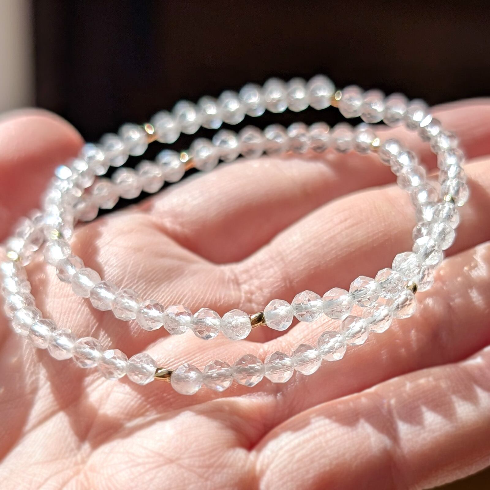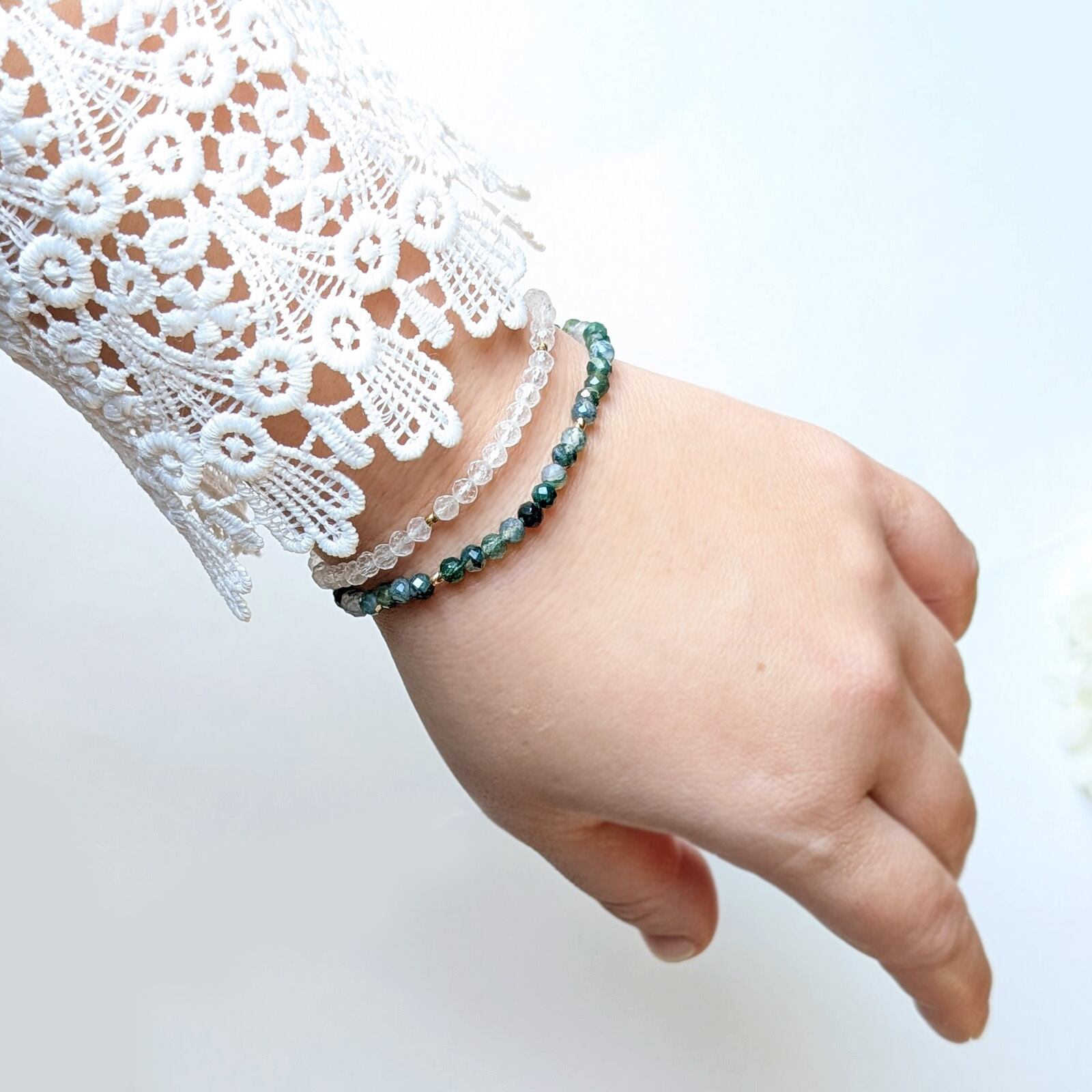 裏から光が通ると透明感が増してきらめく、冬の時期にぴったりのブレスレットです。