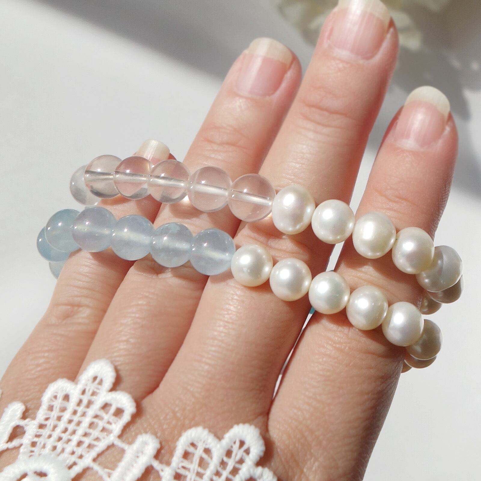 Tri/一点もの ローズクォーツ×アクアマリン×淡水ホワイトパール トリブレスレット
