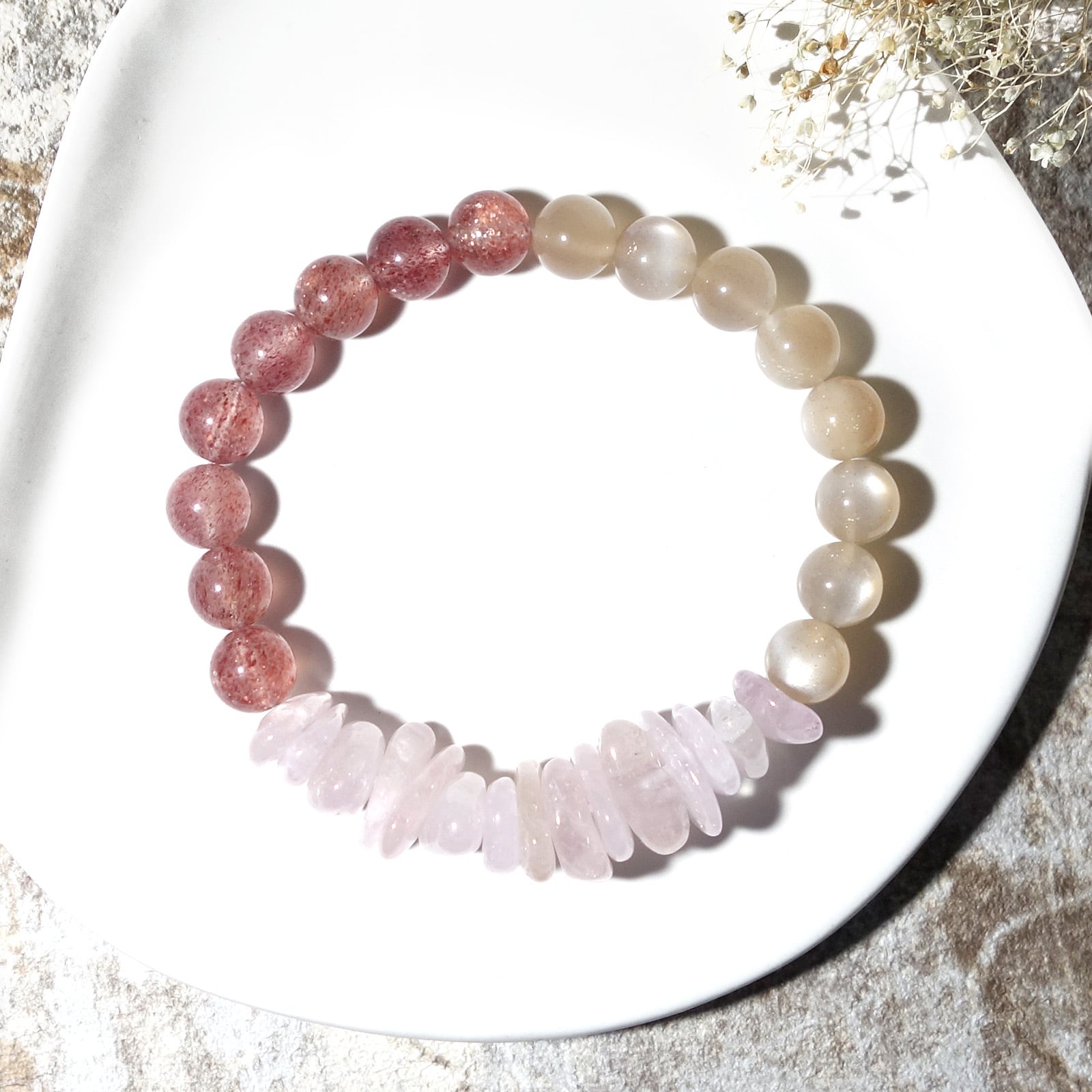 Tri/一点もの モルガナイト×ベージュムーンストーン×ピンクエピドートシスト トリブレスレット