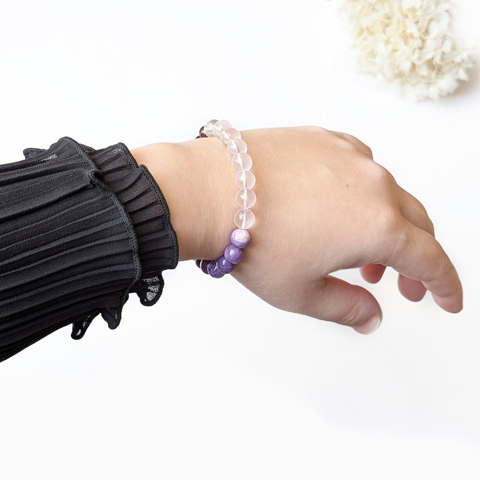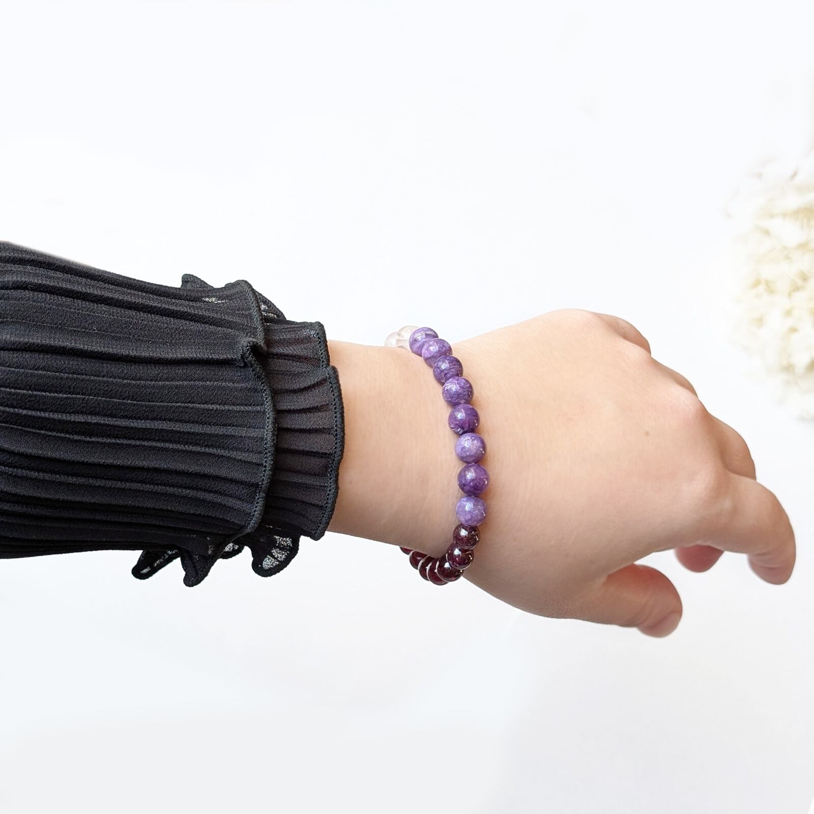 Tri/一点もの チャロアイトシリカ×ロードライトガーネット×シルキーローズクォーツ トリブレスレット