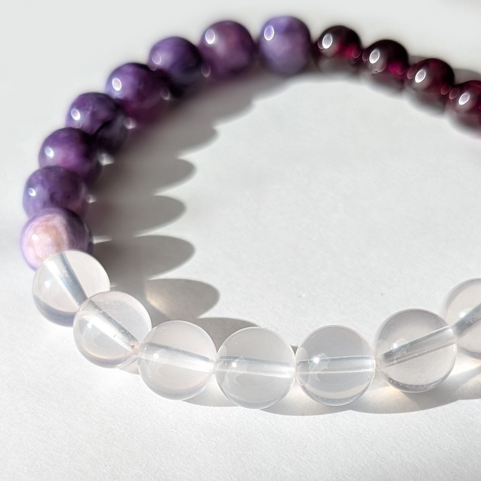 クォーツ化した透明な部分があったり、チャロアイト特有の絹糸光沢が光ったり、一粒一粒の表情が全然違います。