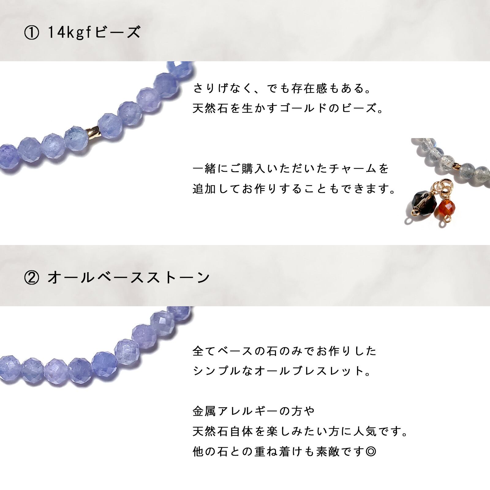 14kgfビーズを、極小粒ブレスレットと同じ約4mmサイズの石へ変更し、天然石のみでお作りできます。