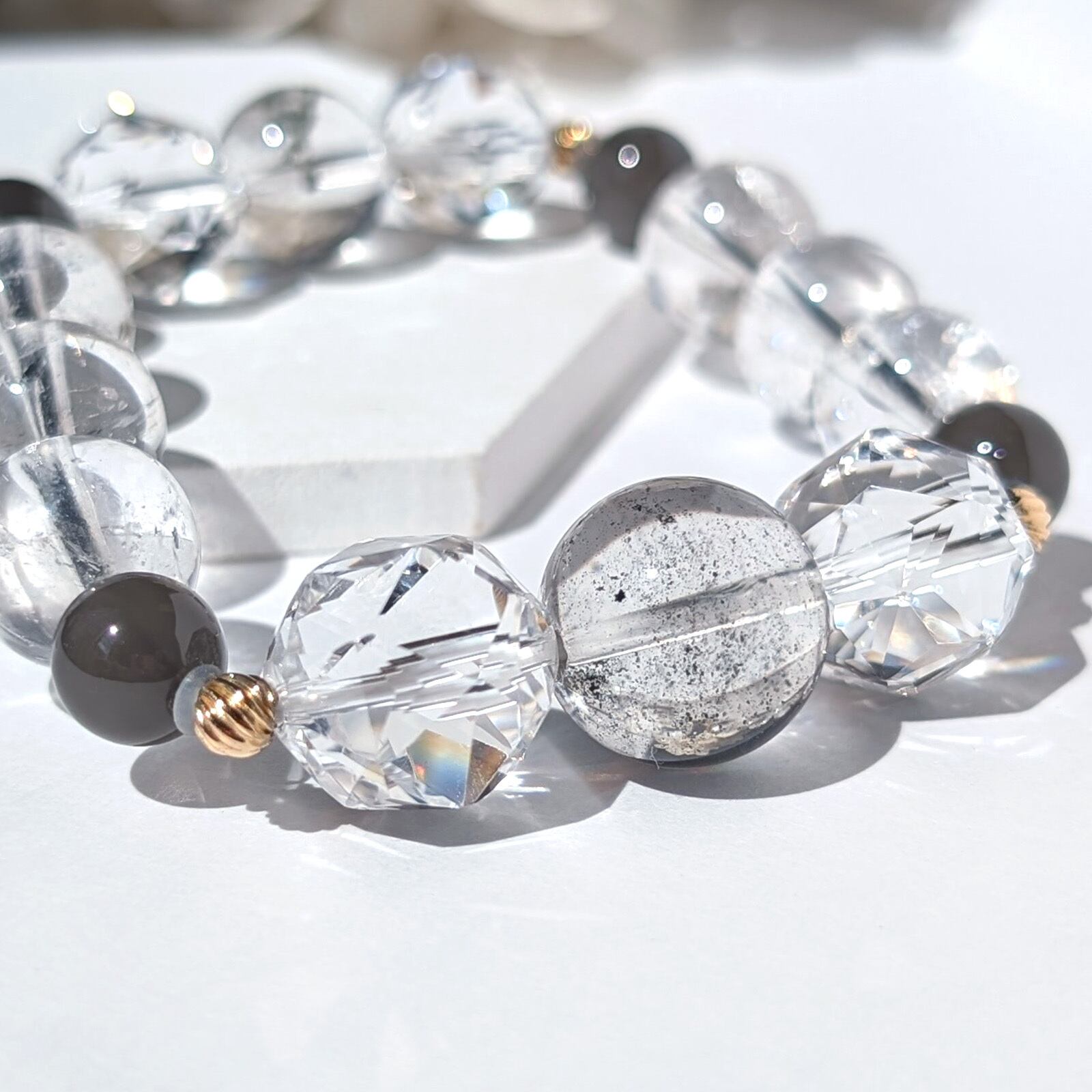 水晶の透明度が高く、エレスチャルらしい黒のインクルージョンも所々にあり、クラックに輝くレインボーやミラー効果が表れます。
