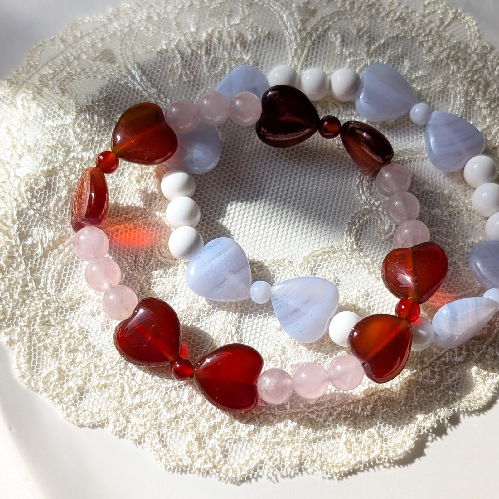 レッドアゲートのハートをリボンに見立て、ふんわり優しいローズクォーツを合わせた、ラブリーでキュートなブレスレットに仕上げました。
