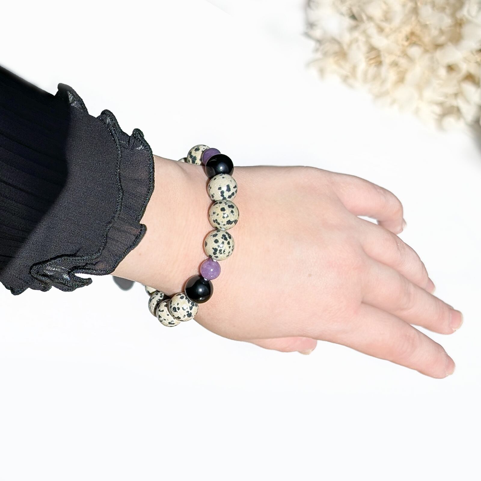 Grace/一点もの 大粒ダルメシアンジャスパー×オブシディアン×フェルドスパーマイカ グレイスブレスレット
